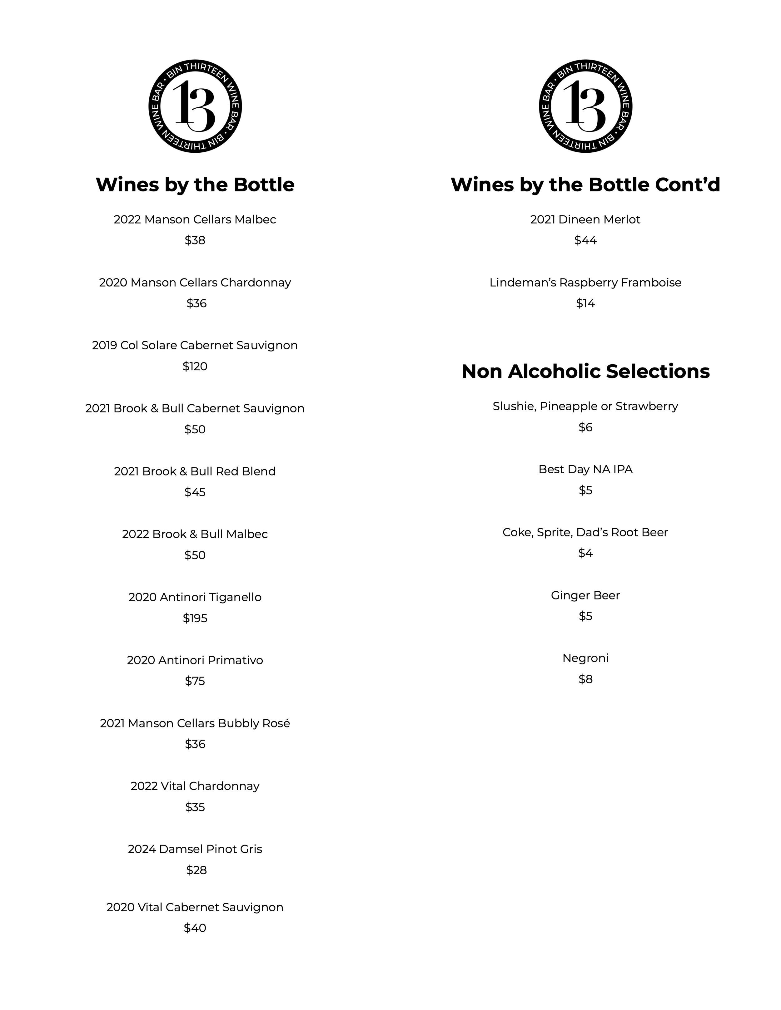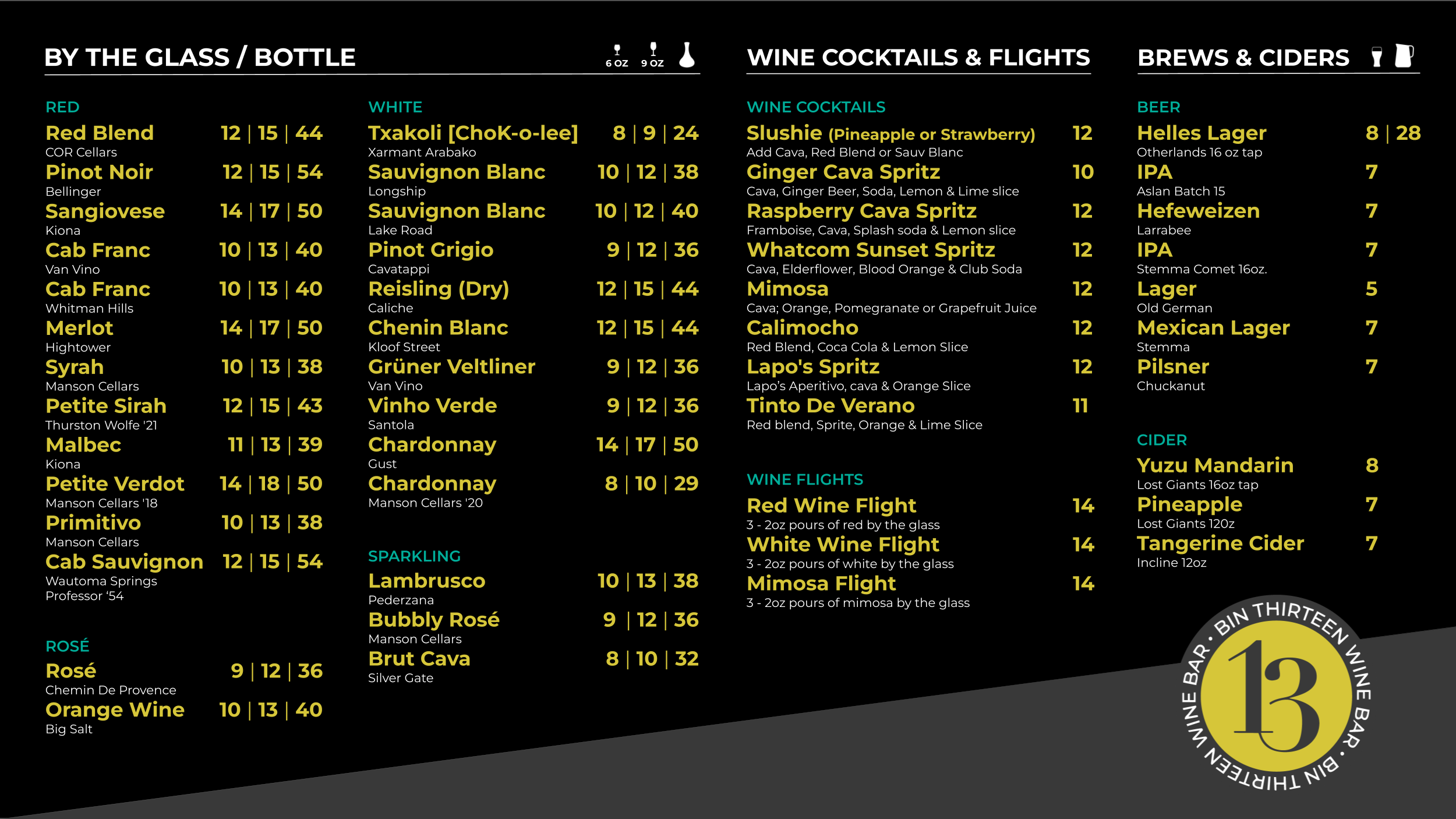 Please enjoy our selection of wines, brews, and ciders.